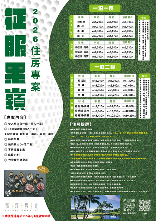 ★依房型入住人數提供早餐及燒肉,再贈迎賓水果 ★價格均含果嶺、桿弟、球車、保險、稅金等費用,擊球每組不足4人時需補球車價差,費用由客人於球場現金自付 |