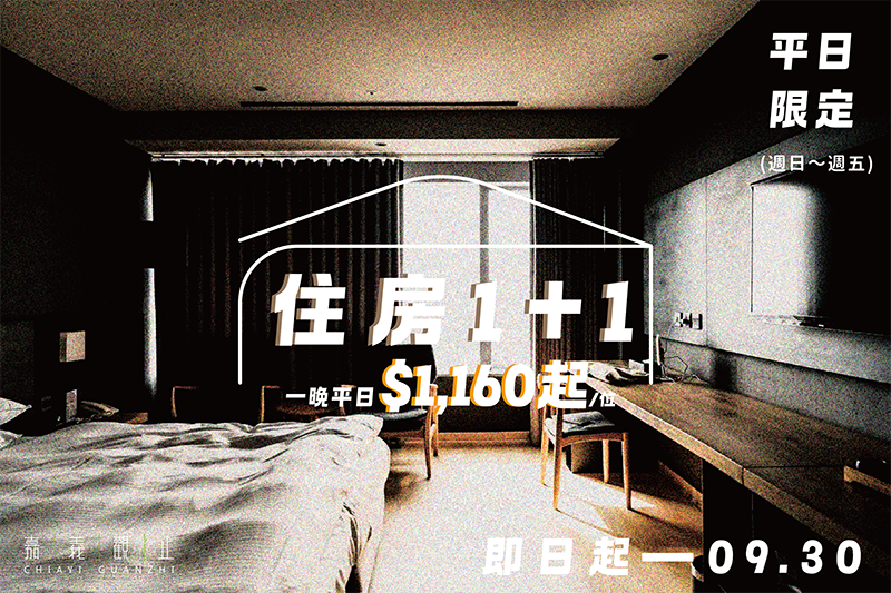 嘉義觀止推出「住房1+1」優惠專案,享有優惠的同時,還可依需求自由選擇,讓旅遊更具彈性,享受雙倍的服務。