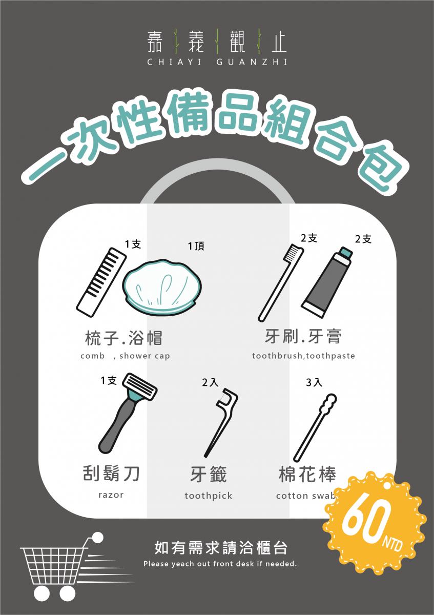 配合環境部相關規定,自115年1月1日起,住宿期間將不再免費提供梳子、牙刷、牙膏、刮鬍刀、刮鬍泡及浴帽等一次性旅宿用品,敬請旅客自行準備;如有需要,可至大廳櫃台購買,另行收費。