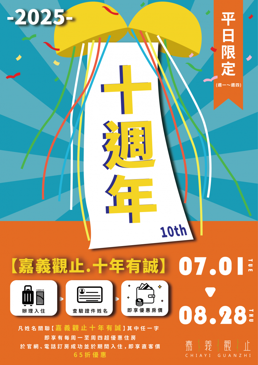 嘉義觀止邁入十歲了,回饋所有賓客的支持與鼓勵,推出「嘉義觀止 十年有誠」住房活動